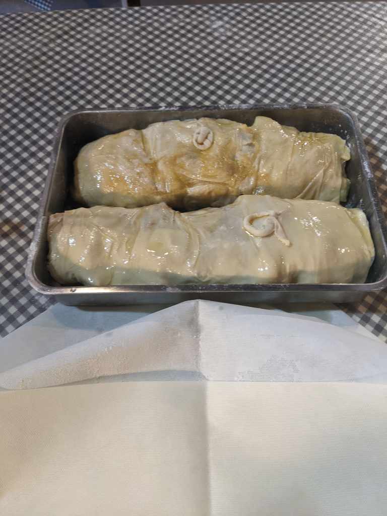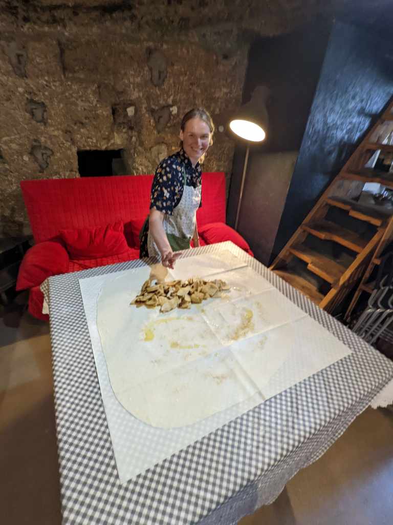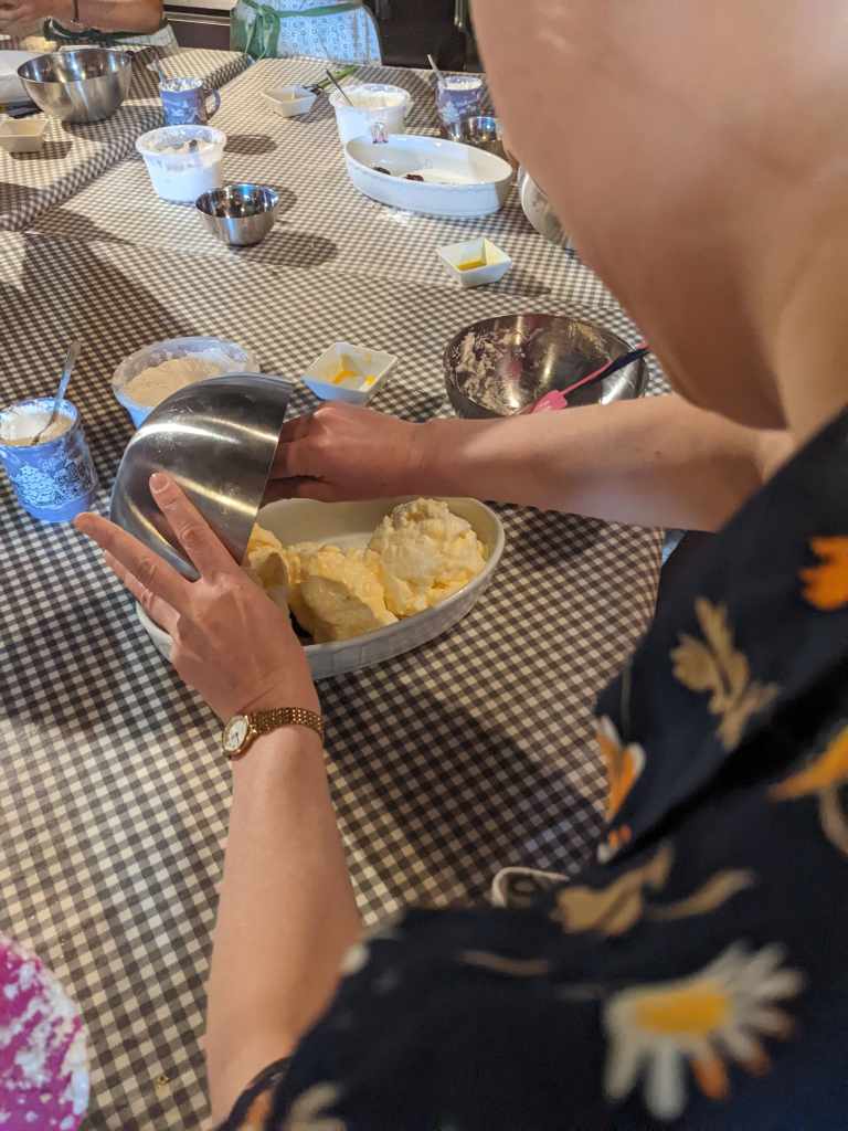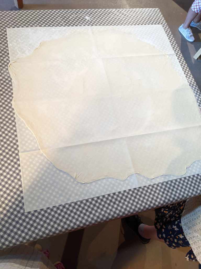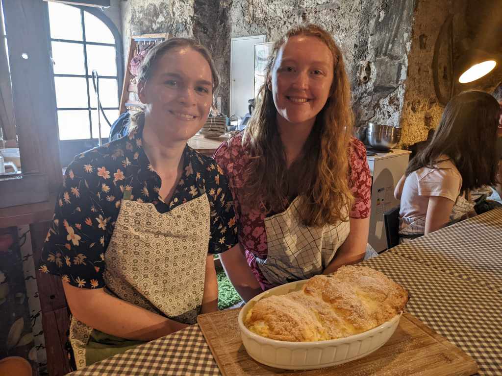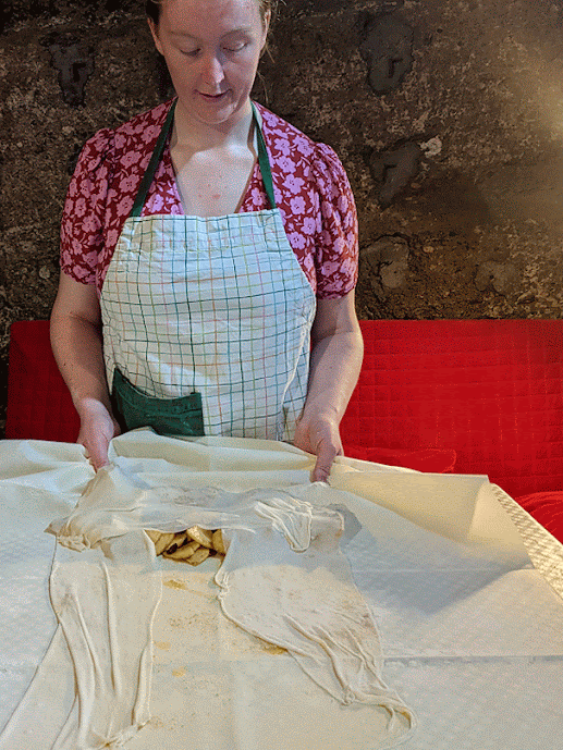 Fortunately for us the cookery teachers had already made the strudel dough, so we didn’t have to spend 24 hours in the cave waiting for our appley treat. Instead we mixed some apples, raisins, sugar and cinnamon – hello, we are calling from Yankee candle HQ. Next we spread the dough to Lady Cassandra thinness with our knuckles, lifting the dough and spinning around the table like we were in a nursery rhyme.
