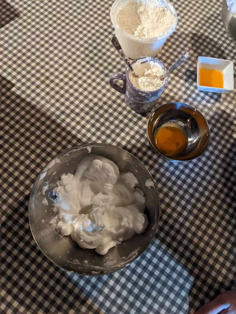 While the strudel baked and the cave heated up, we got cracking on our nockerl. The tables were reshuffled and we came into groups of three so that we could add a peak each to our nockerls. We beat our egg whites with sugar using some very efficent ikea egg whiskers that we all swore to buy immediatley after leaving the class (it is 6 months later and we are still sans magical whisker). Next we added the suggested extra of an egg yolk.. for stability? This would prove a questionable choice later on…