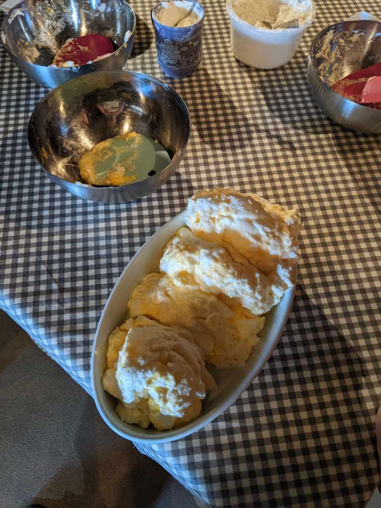 After we’d folded in some flour to keep those peaks stiff, we plopped our uncooked nockerl in a dish.