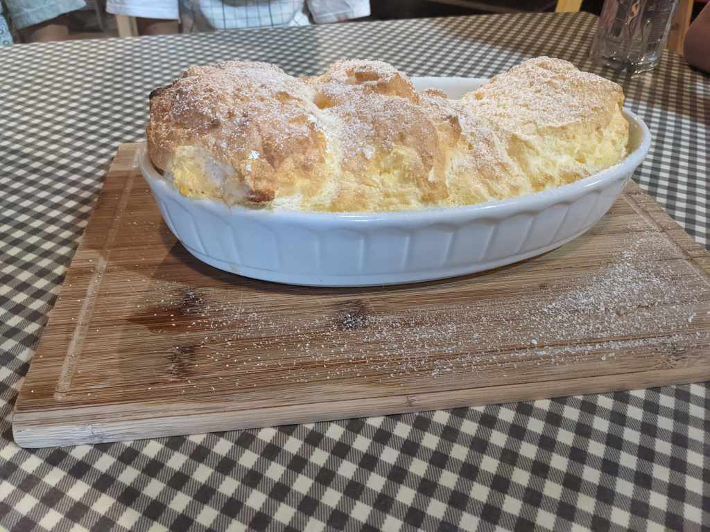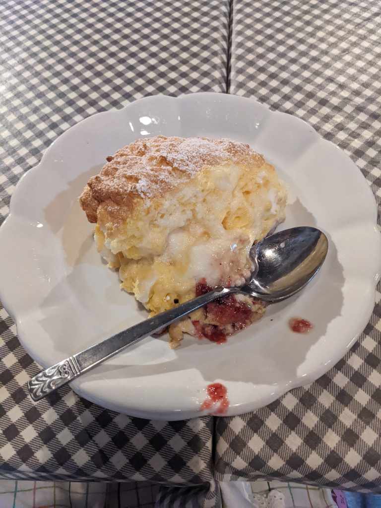 We sat down to our unseasonal lunch of goulasch soup and sweated as we wated for our tasty homemade puds and talked shop about covid times with a lovely family from America. Below is a picture of the finished nockerl – it doesn’t look as much like the high peaks of the Alps as much as the mountains of the UK, which are weedy and flat; so we will call it a homage to home.