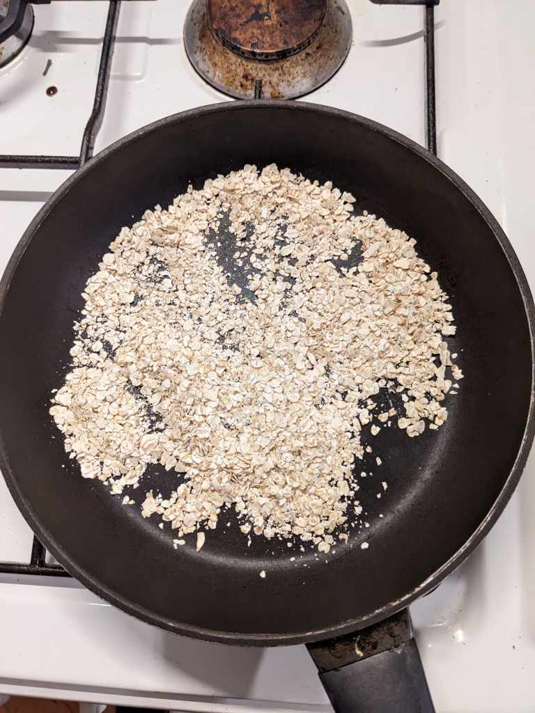 Start this recipe by toasting your oats to give them a nutty hit. Put 40g oats in a frying pan and heat gently until they smell like your favourite nut (no, stop looking at your friend, they won’t like that). Once toasted, put to the side to cool down.