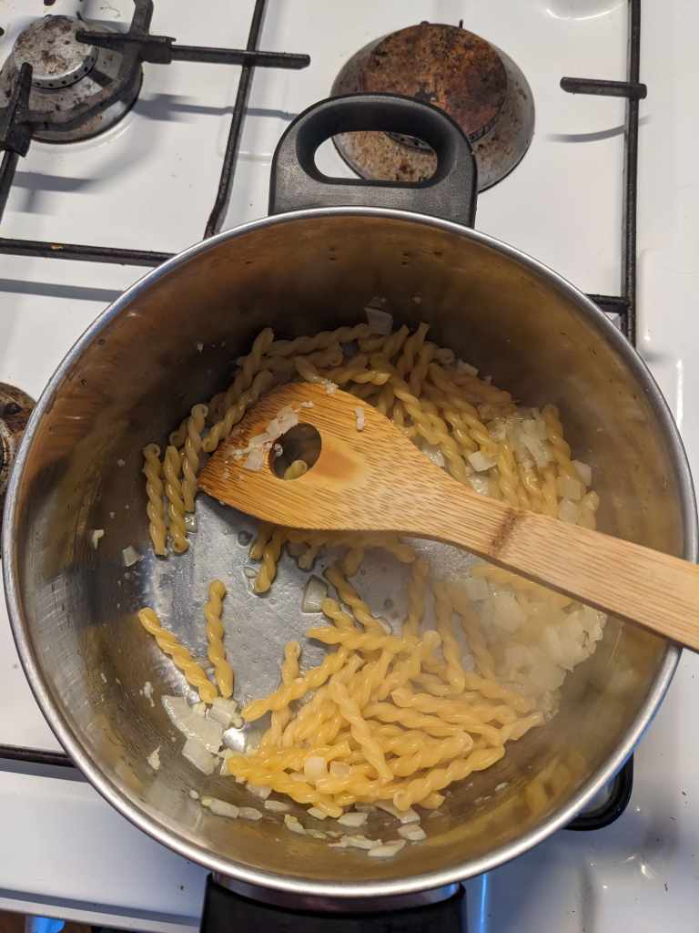 Melt 1tbsp of vegan butter in your saucepan and chop and add half an onion and two cloves of garlic. Once these have browned slightly, add in 1 cup of your pasta of choice (the original uses orzo, but we chose gemelli for our belly!).