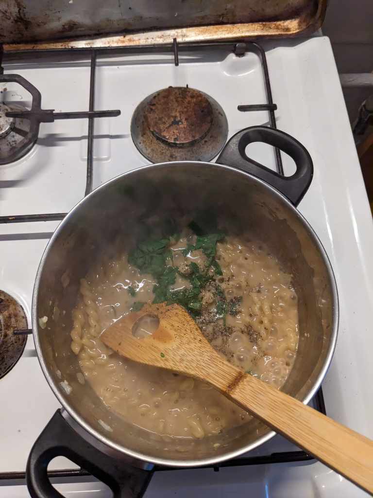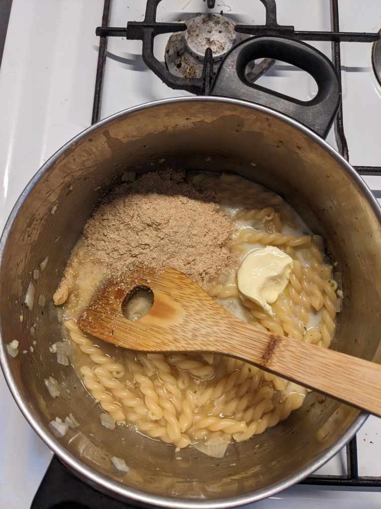 Once the pasta has cooked, add in the remaining 1tbsp of vegan butter, 1/4 cup nutritional yeast, 1/3cup plant milk, 1/2 tsp salt and 1/8 tsp black pepper. Stir together and bring back to a simmer.