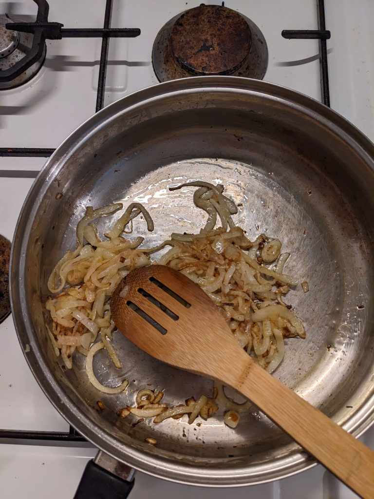 In a large saucepan heat 3tbsp olive oil on a medium heat. Whilst the oil heats up thinly slice an onion and then toss into pot. Cook your onion until crispy cronchy – around 20 minutes. 10 minutes into cooking add in 3 cloves of grated or minced garlic.