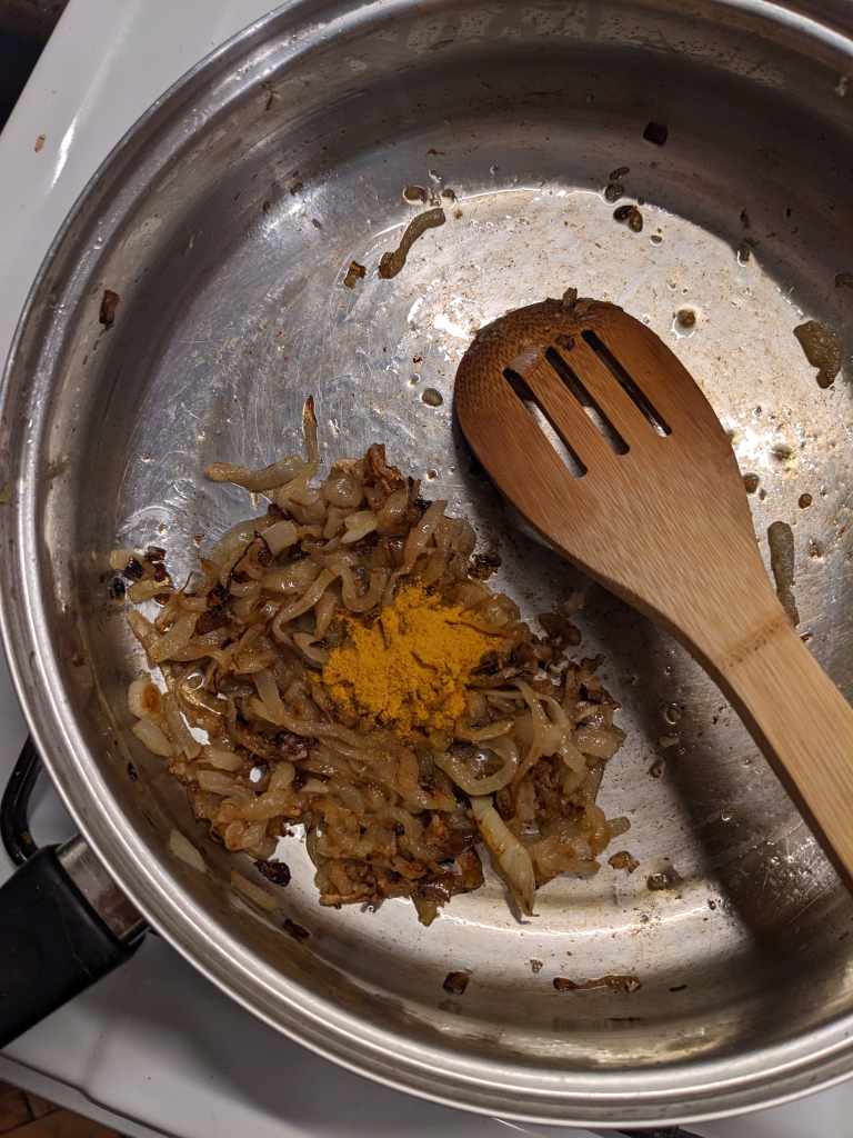 Once your onions are crunchier then a piece of stale toast, turn the heat off and add in 1/2tsp turmeric. Stir immediately so that it doesn’t burn.