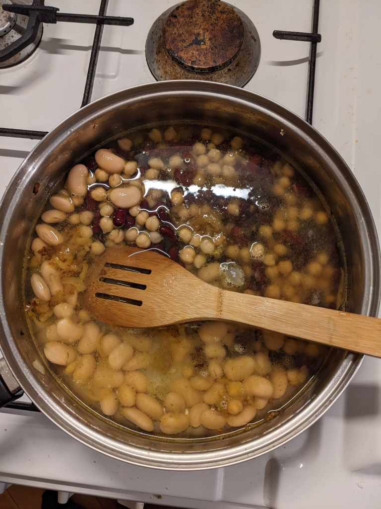 To the onions still in the pan add 1/2 tin chickpeas, 1/2 tin kidney beans , 1/2 tin white (haricot) beans, 3 cups of stock (chicken or veg – you decide!) and 1/4tsp ground black pepper.