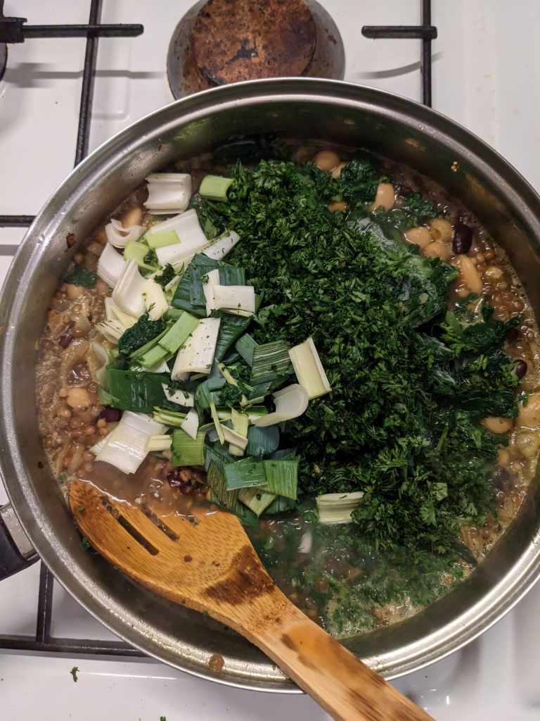 Next, add half a tin of green lentils and then cook the ever boombarier concotion for five further minutes. Then add in 1 cup spinach, your bunch of parsley and coriander and dill, chopped, half a leek, also chopped, and a few fenugreek leaves (if you have them, if not the seeds will do indeeds).