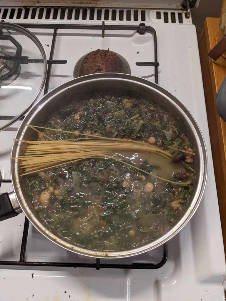 Add your 45g of linguini into the pot with everything else and cook for ten minutes.