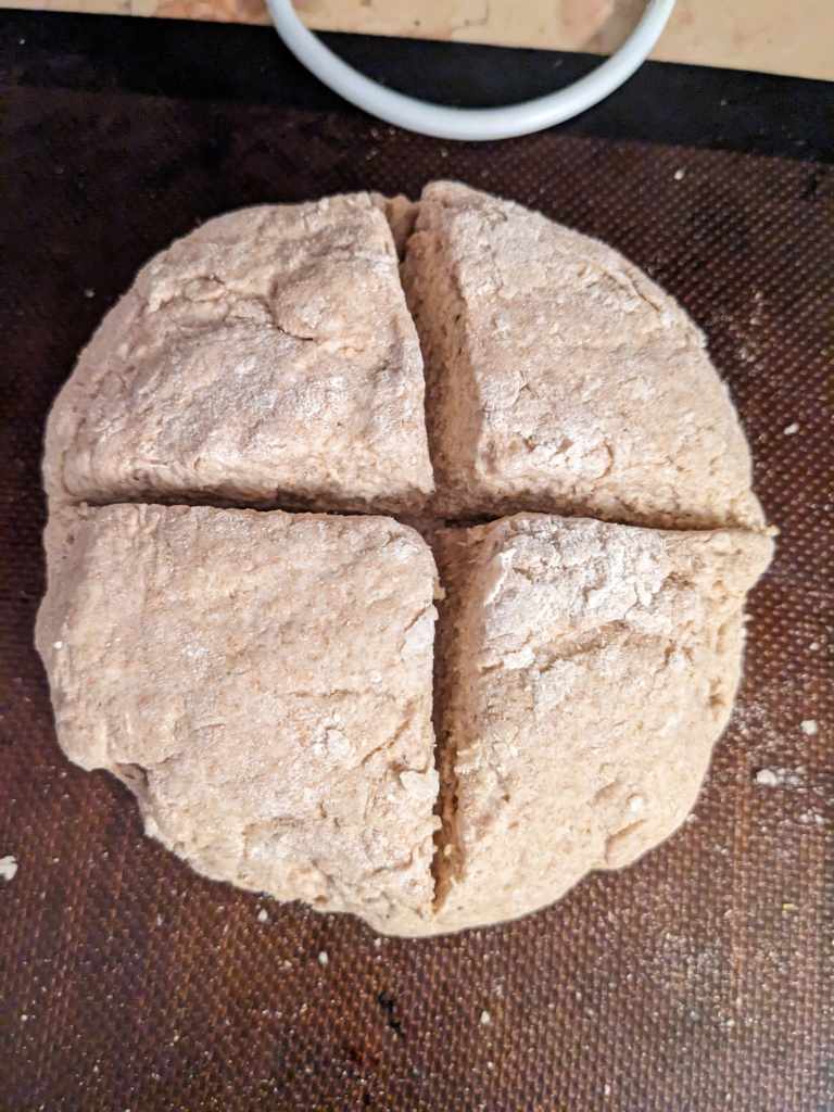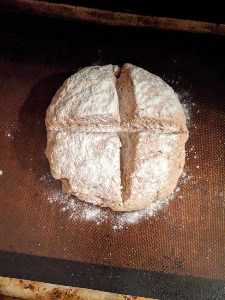 Form the dough into a ball, but don’t get the lads over for a game of footie! Instead, place it on a lined baking tray. Cut down into the dough 1/3 of the way through the entire diameter of the bread (using a serrated knife) and then cut the other direction in the same way to form a cross.