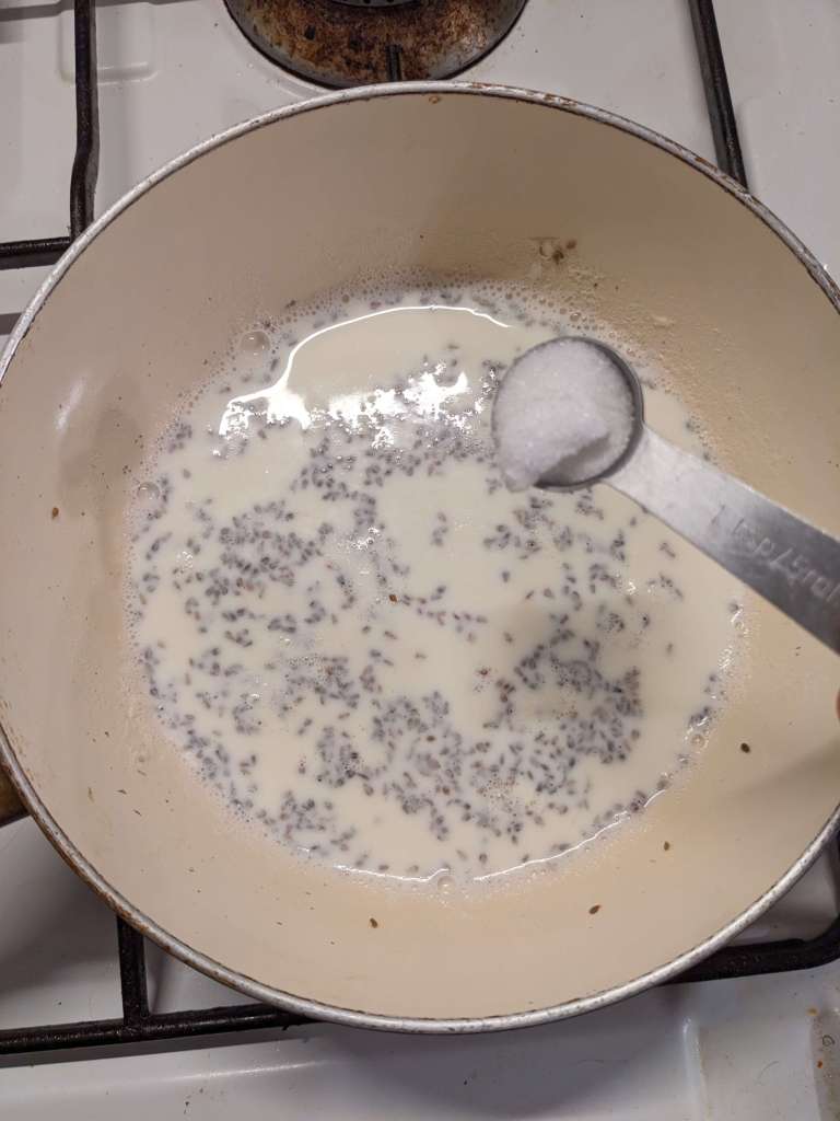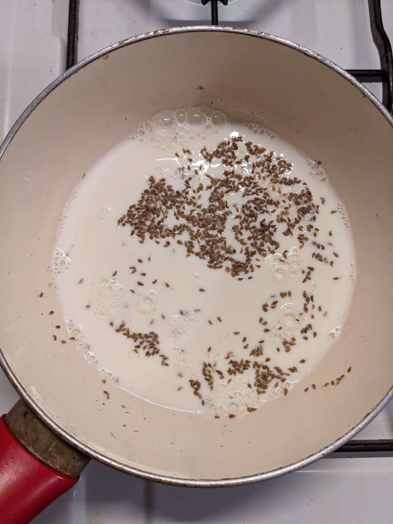 Pop the cup of milk and a tsp of aniseed seeds into a saucepan and warm gently over a low heat until warm, but not boiling! No milk skin here thank you Grandma!