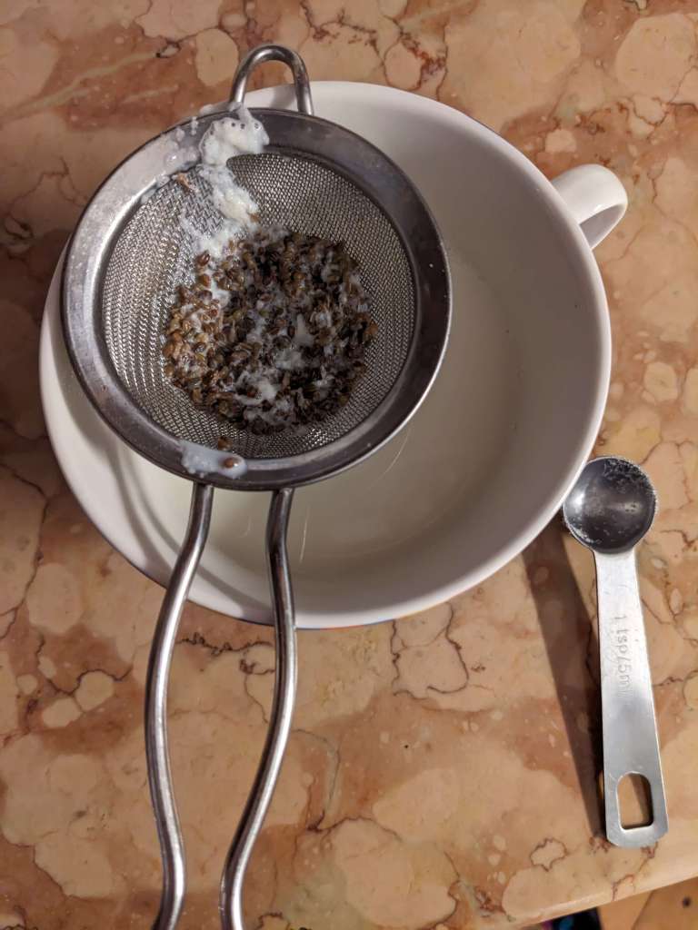 Pour through a strainer into your mug of choice.