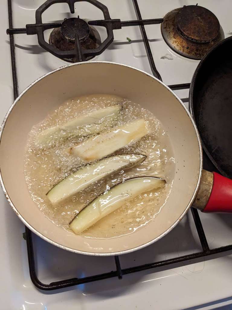 When the time is almost up, heat your oil until the end of a wooden spoon bubbles when put in to it. Then fry the aubergines in batches until they are golden brown, putting them on a kitchen-towel covered plate to drain.