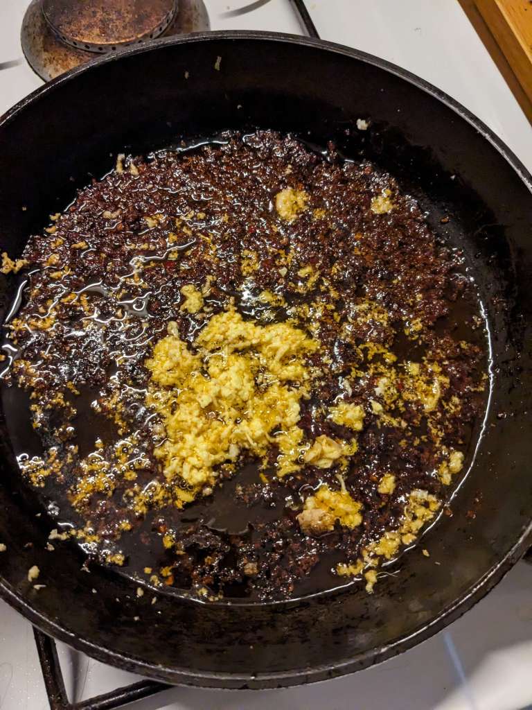 Add in 1 1/2tbsp Sichuanese chilli bean paste stirring it around until it begins to smell fragrant. In the meantime chop or grate 1tbsp ginger and 1tbsp garlic and add these once the oil has separated out from the chilli bean paste. Stir everything together until it is FRAGRANT as the name suggests being careful not to burn anything.