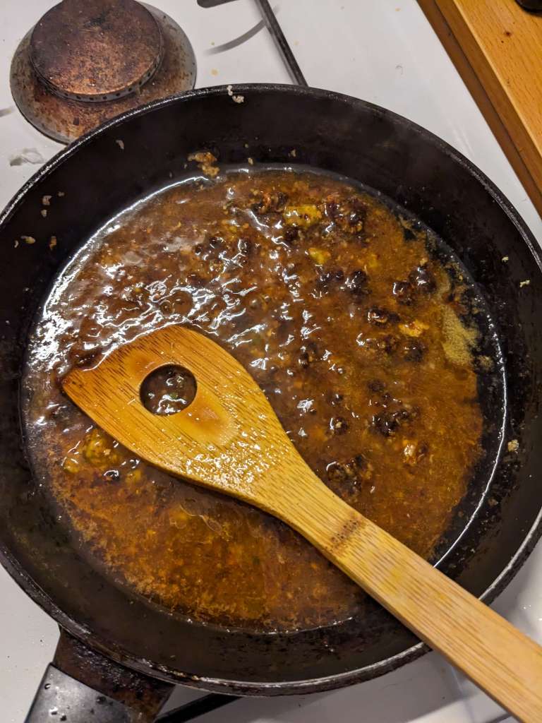 Once the aubergines are fried, you can either empty the original pan of oil (you were supposed to use a wok, we didn’t) or simply do it the gasp way and use yet another piece of kitchen equipment, aka get a different pan. Warm 3tbsp of neutral oil in whichever vessel you have chosen.