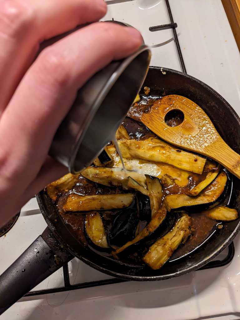 Next throw in your aubergines to coat them in the lovely fragrant sauce. Once they have had a minute with the sauce to get acquainted, add in your slurry (which is 3/4tsp cornstarch mixed with 1tbsp cold water in a separate mug to form a smooth liquid) to thicken and sticken the sauce.