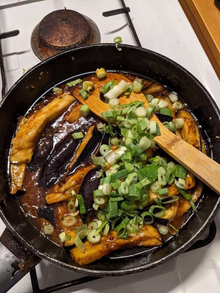 Lastly, add 2tsp Chinkiang vinegar and chop/snip in your 2 spring onions and stir it all together. Taste here for salt – you might want to add a pinch more or you may already get enough from the aubergine.