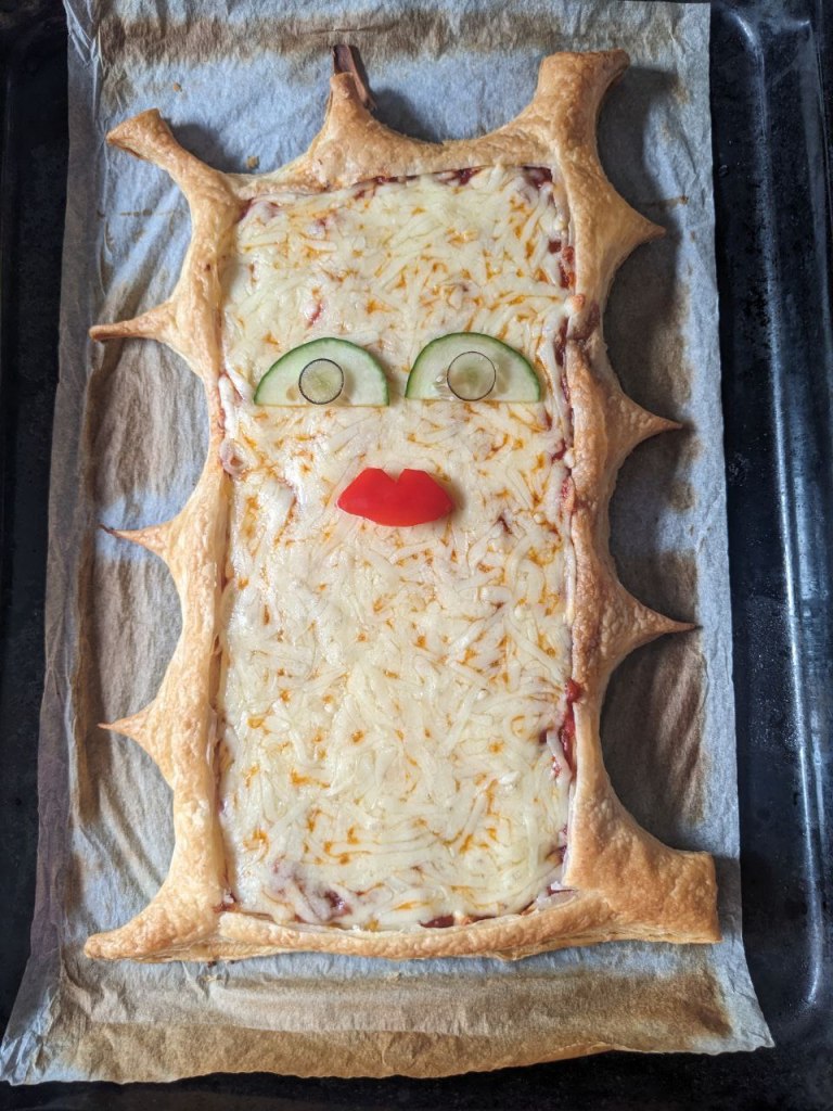 While your pastry is cooking in the oven, carve Lady Cassandra’s face. Firstly, cut a pair of lips from the red pepper. The lips need to be 5cm wide and 2cm tall. Slice your black grape into two very thin slices to make the pupils, and feel free to have a little (or big considering you’ll have a whole bunch) snack on the rest. Cut the cucumber in half and cut two thin slices for the eyes. Doesn’t she look just beautiful?
