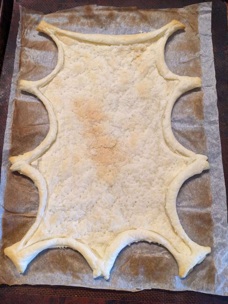 Score around the edge of the pastry sheet about a centimetre from the edge and dock the base with a fork (mistyped this as dork originally which made me laugh for 5 minutes) and bake for 10-20 minutes depending on your oven strength. Push down the risen middle of the pastry with the back of a spoon and set aside to cool.