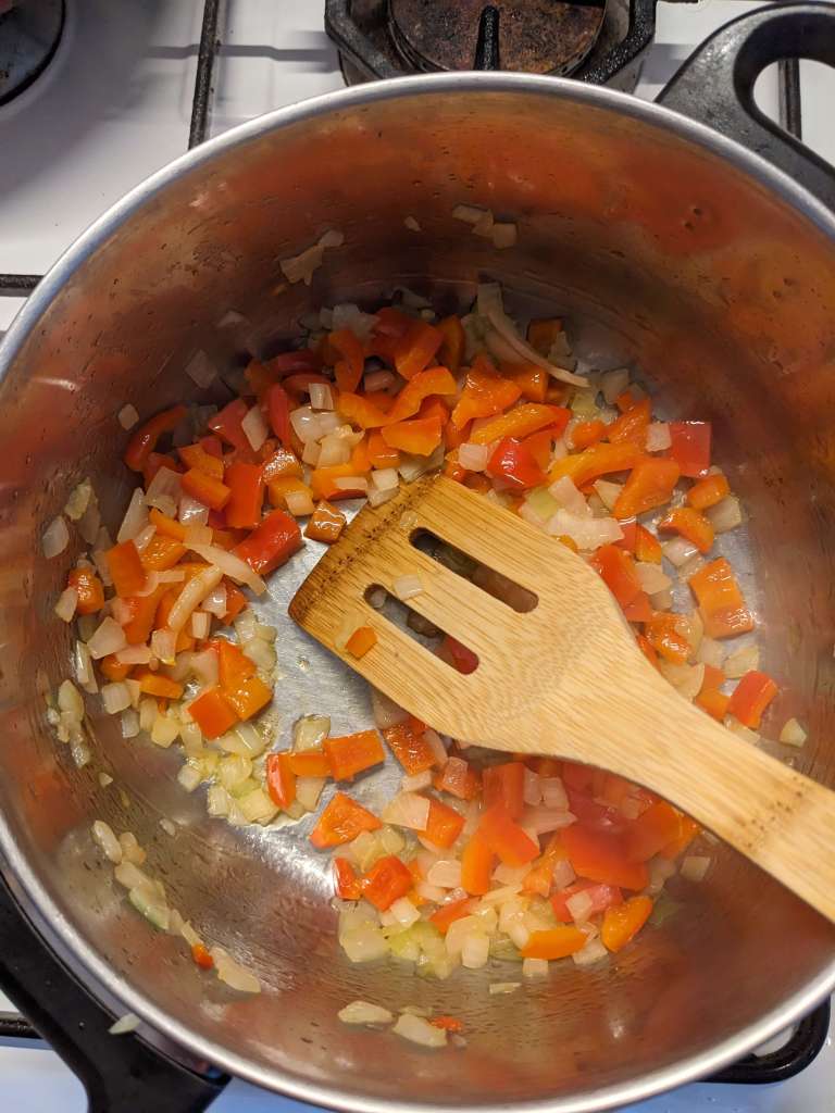 Add the 2tbsp of oil to a pan and fry the onion and pepper for 5-10 minutes until they have softened.