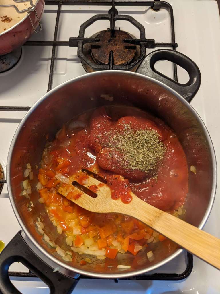Stir in the tin of chopped tomatoes, 1/2tsp of dried oregano and a pinch of salt and pepper. Let that simmer for 10 minutes more until the sauce has thickened.