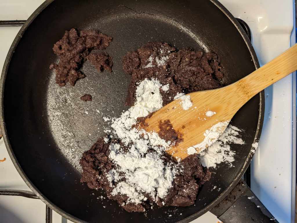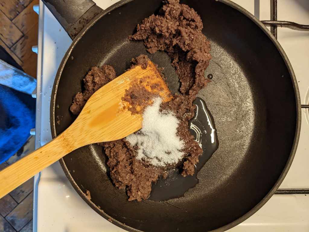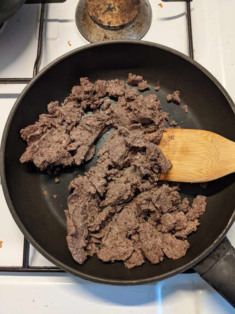 After they’ve had their nice long soak, drain the beans and put them in a saucepan with fresh water. Bring to the boil and cook for 45 minutes to an hour stirring every once in a while. You can check the beans are done by squishing one between your fingers. Why not use this beany time to tune into the ‘Three Bean Salad’ podcast. Once cooked, drain and blend into a smooth paste resembling refried beans and then place into a frying pan over a medium heat.