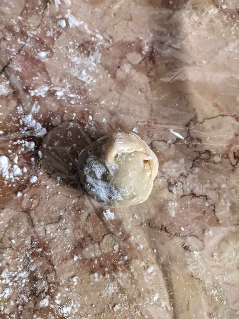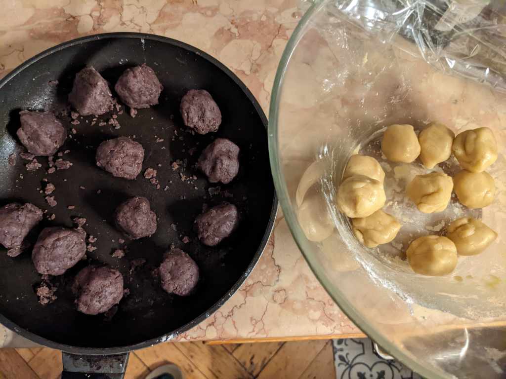 Preheat your oven to 190°C. When everything is either cool or rested, divide your dough into balls weighing 40g and the filling into balls weighing 50g.