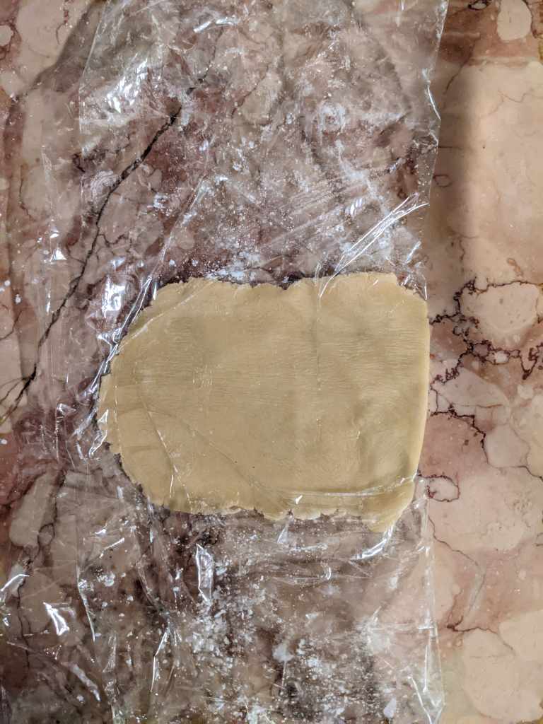 Roll out a ball of dough between two sheets of clingfilm sprinkled with some cornflour until around 10cm wide.