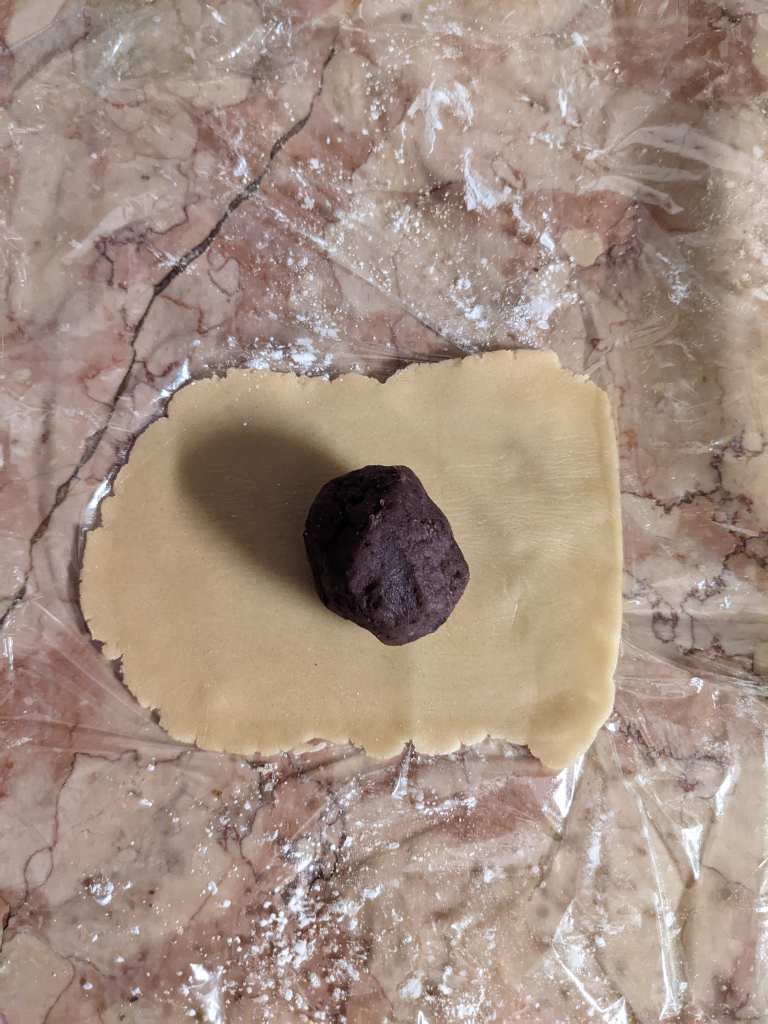 Add a pre-weighed ball of bean paste into the middle of the dough.