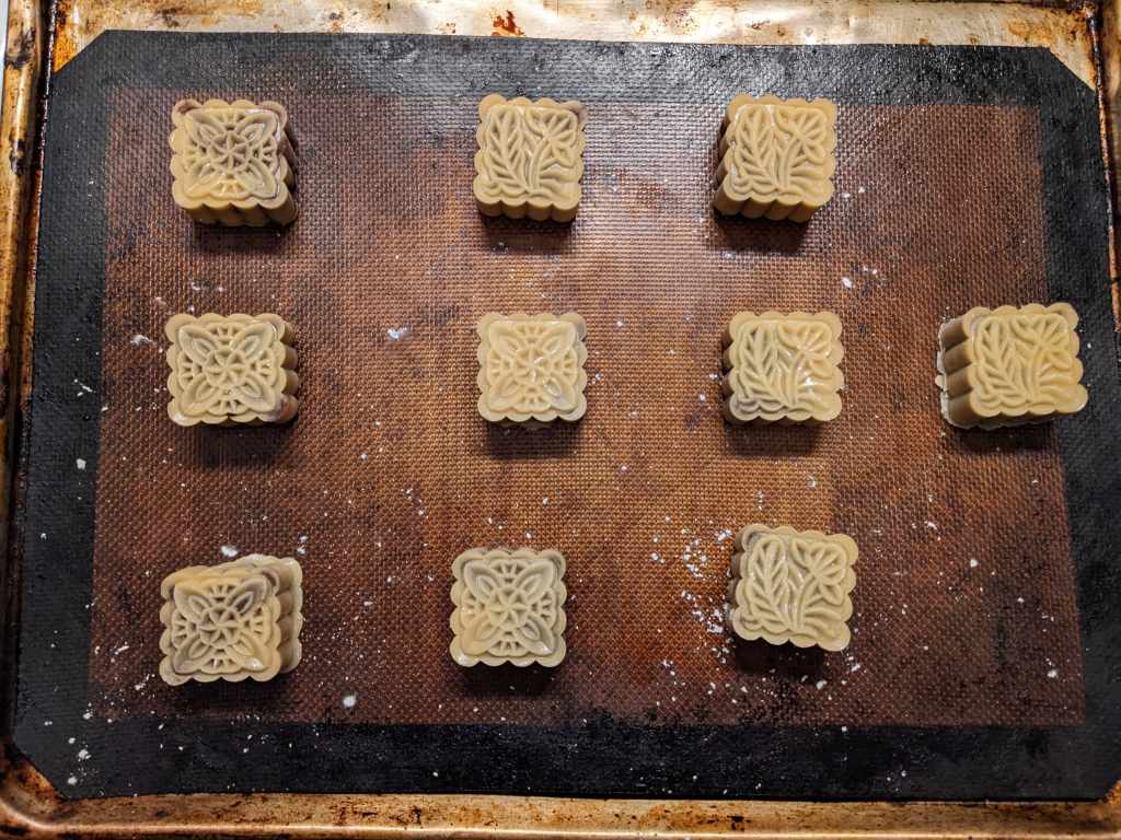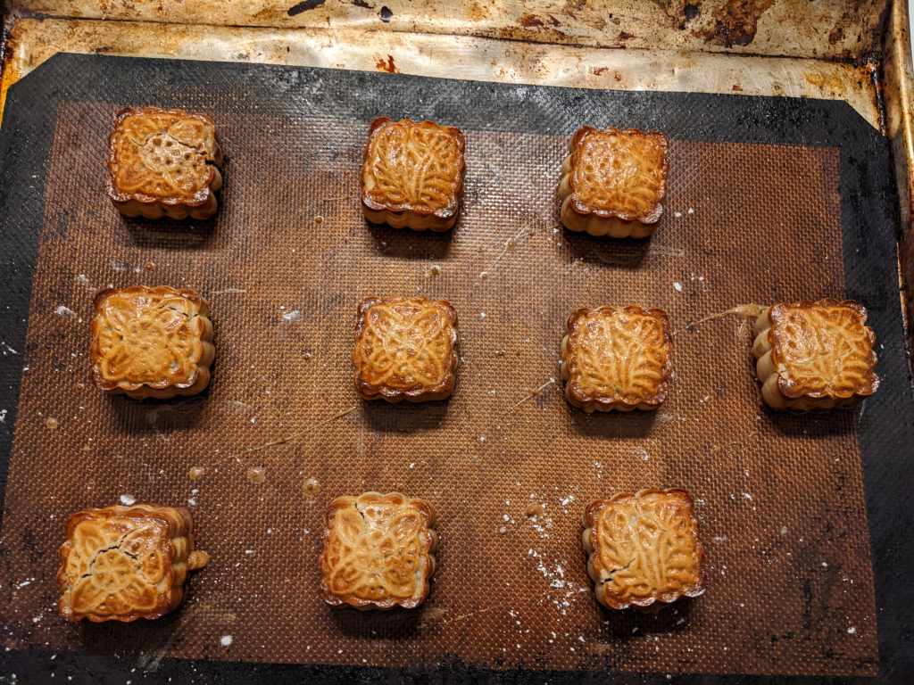 Press this into your mooncake mould and repeat with the rest of the filling and dough balls until you have 10 perfectly formed mooncakes good enough for the Hongwu Emperor to lead a revolution. Flick a little water over them, or spray if you have a spray bottle and put them into the oven for 5 minutes