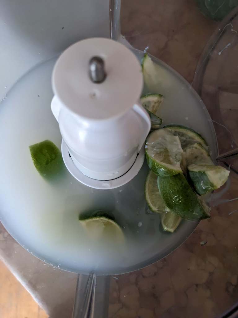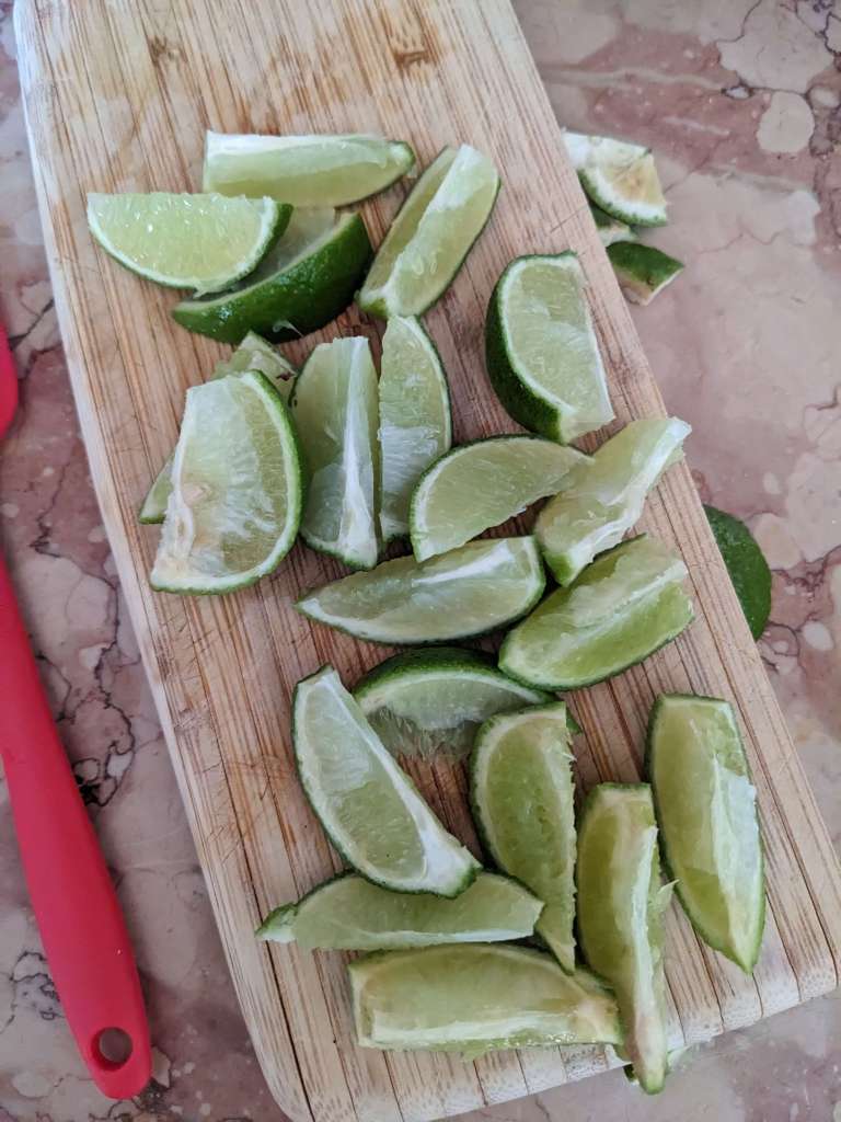 First gather your 3 limes. We’ll actually only be needing two and a half for this recipe, so save one of the halves for something else delicious . Cut the remaining limes into eights.