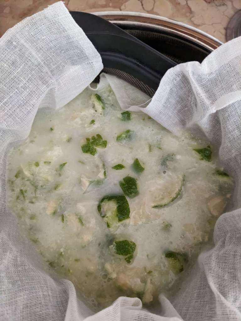 Pulse the mixture for 15 seconds only! Any more, and the mixture will become bitter. Once blended pour this through a cheesecloth or very fine strainer.