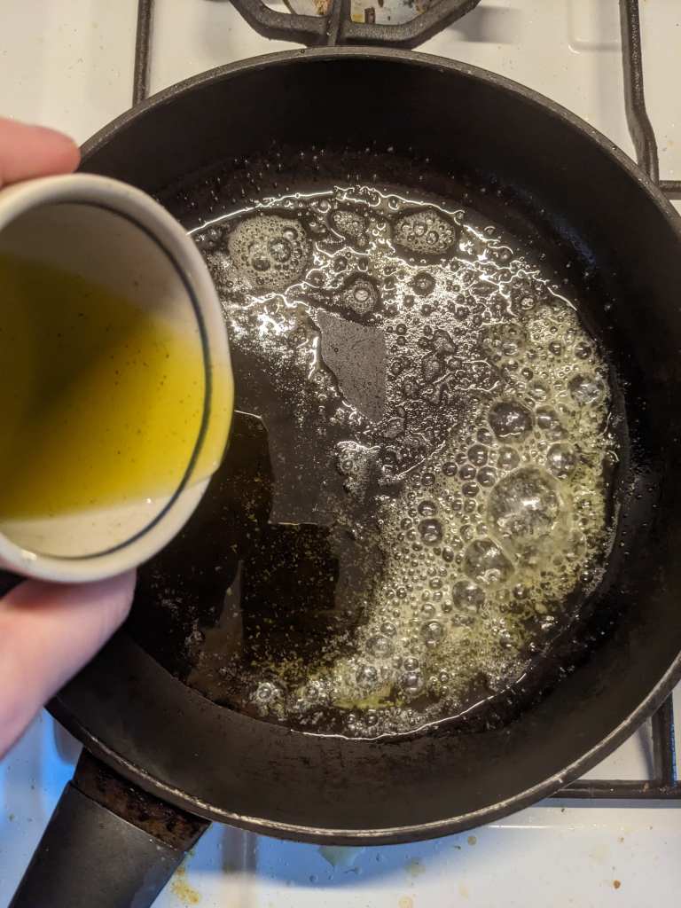 Once the oil is hot and the butter has melted add in you little garlic strips.