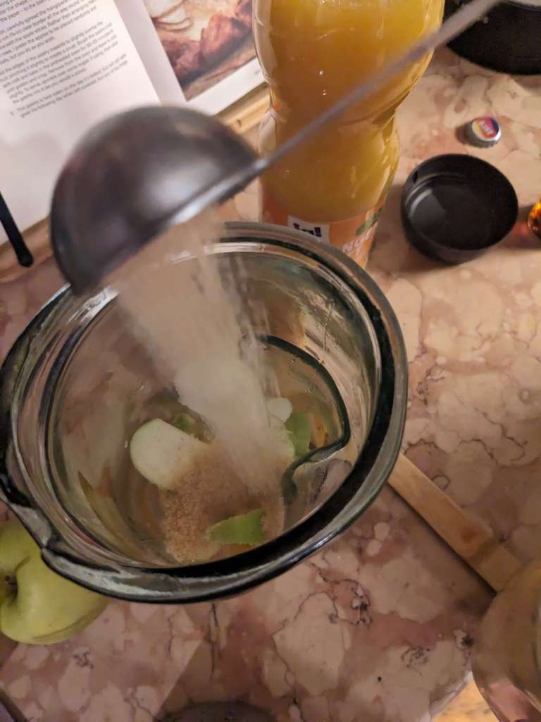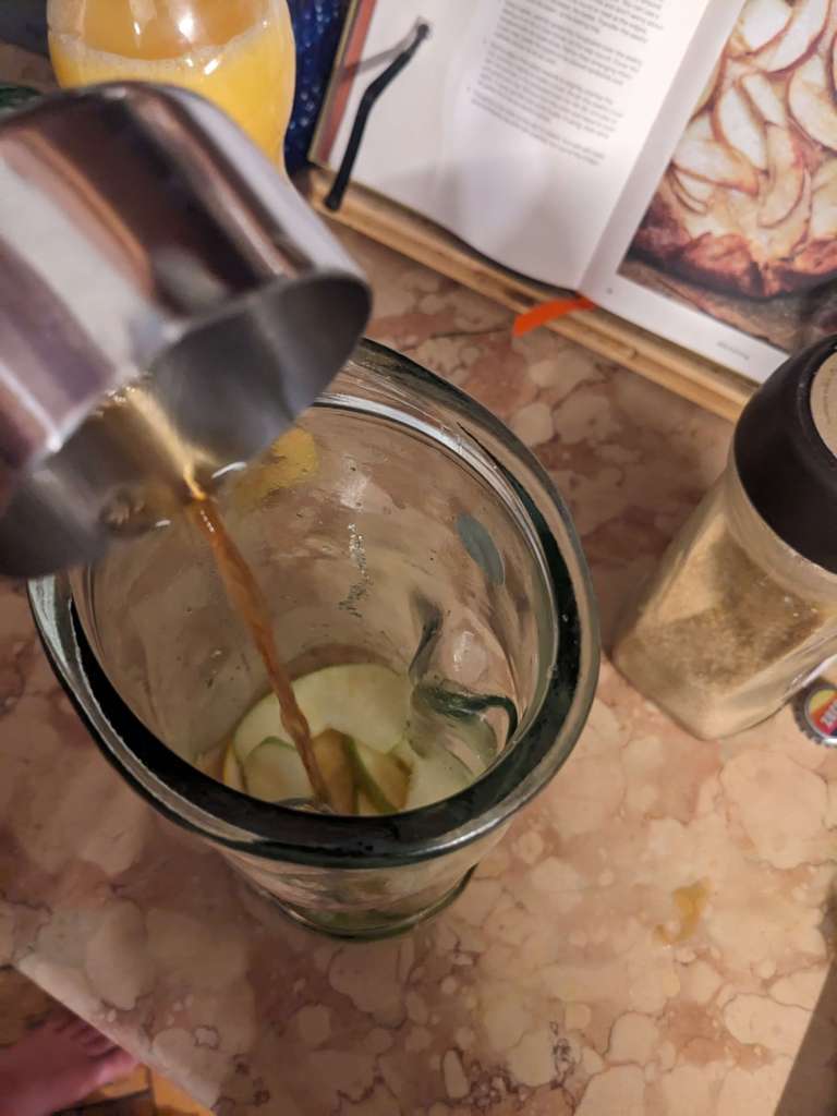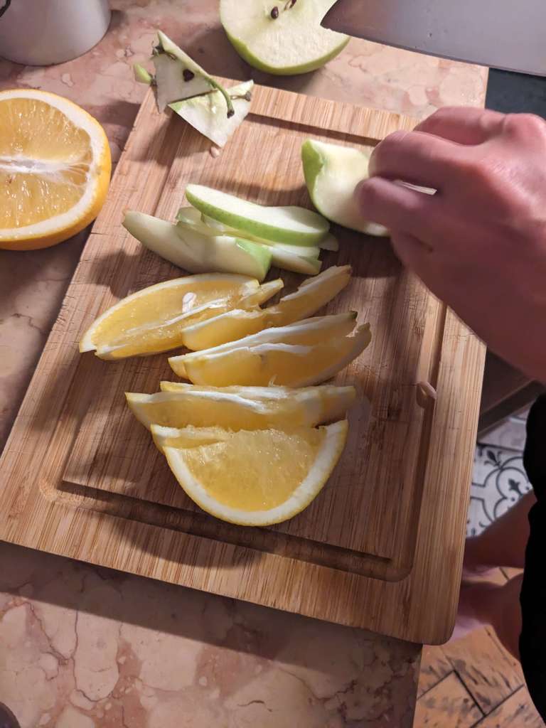 Chop up 1/2 apple and 1/2 an orange into slices and pop them in the bottom of a suitable vessel aka a jug.