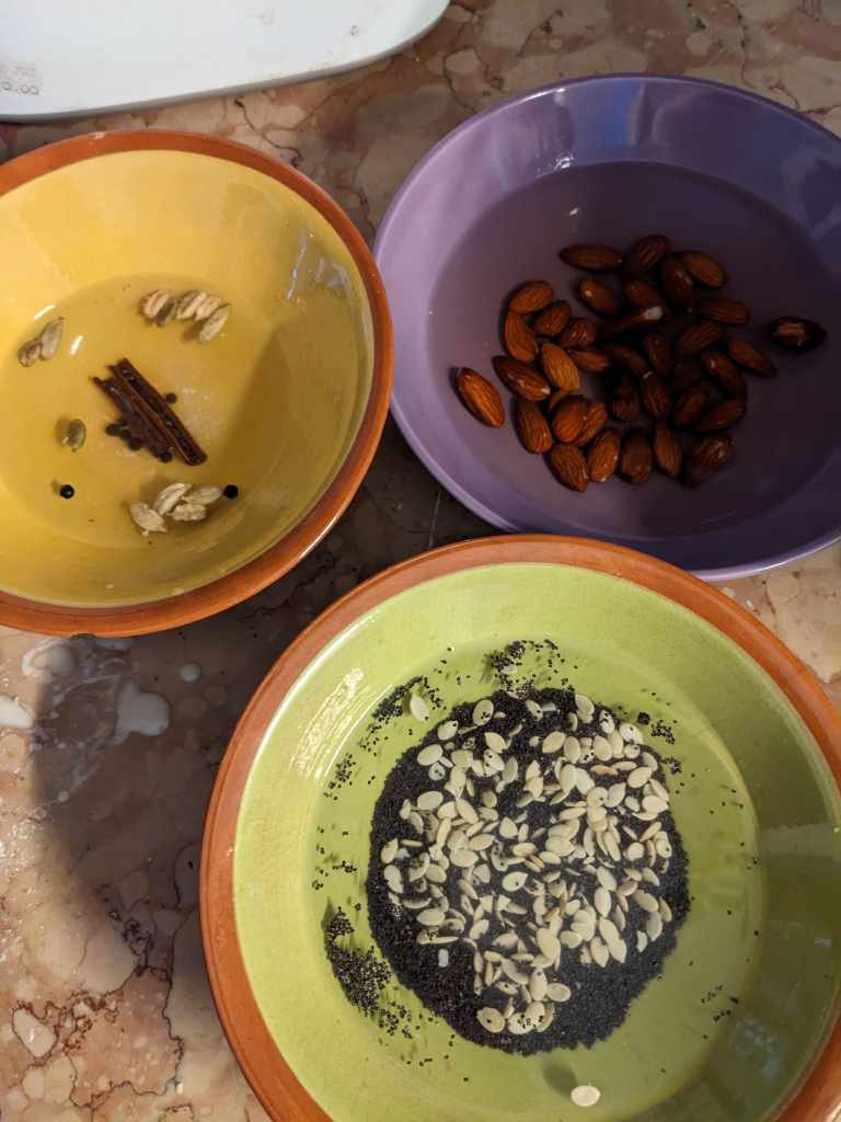 Begin your thandai by soaking 35 almonds in hot water for an hour. In a separate bowl (you ceramics tsarina) soak 1 1/2tbsp poppy seeds and 1 1/2tbsp melon seeds.