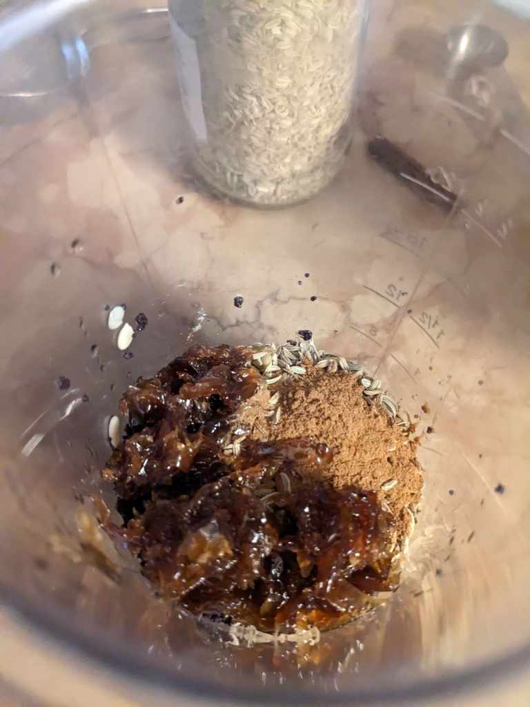 Drain the water from the almonds and add them to a blender alongside the drained melon and poppy seeds, 1 1/2tbsp fennel seeds,12 cardamom pods, 1inch of cinnamon (or 1/2tsp of cinnamon powder), 7 black peppercorns, 1 pinch saffron and rose petals if you have some lying around or a few drops of rose water if not, or you can wait until later and add in some gulkand.