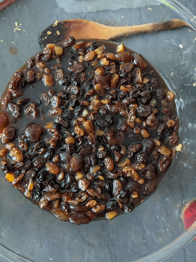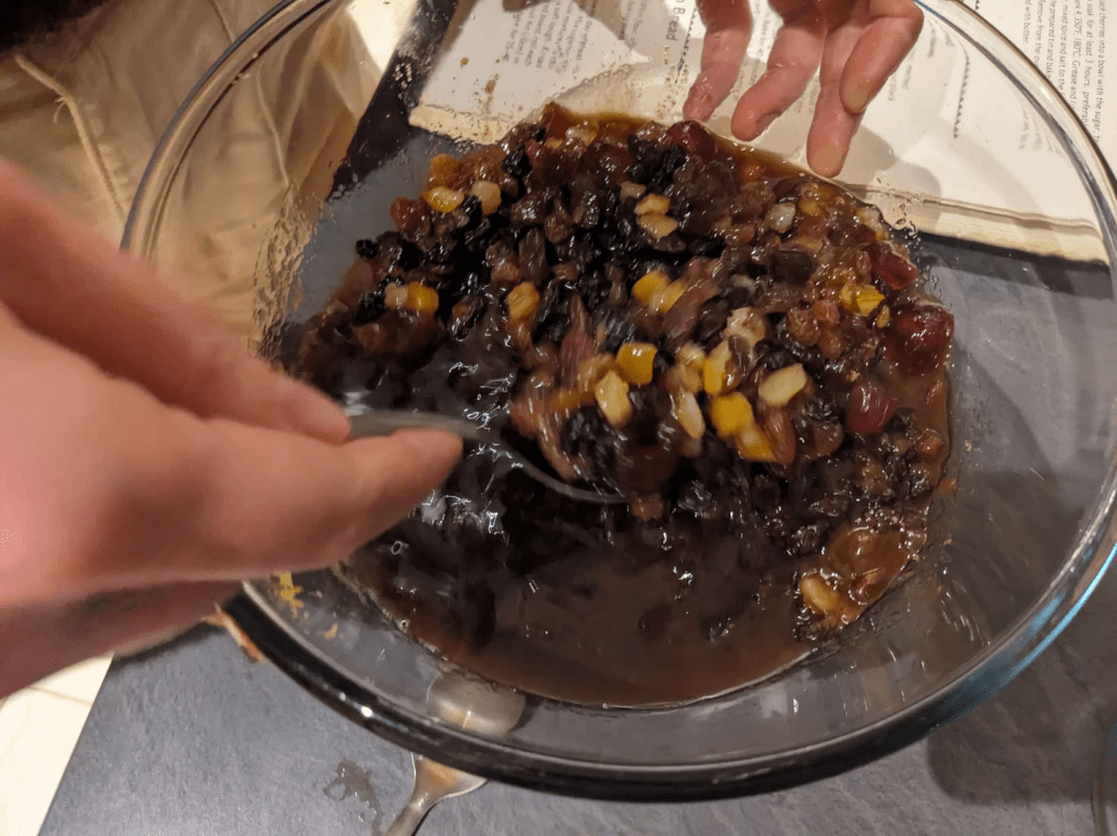 Pop the dried fruit ( 100g raisins, 100g currants, 100g sultanas, 50g mixed candied peel and 50g glace cherries (quartered)) along with 200g brown sugar, 300ml cold black tea and the grated zest of the lemon into a bowl, give it a mix and leave to soak for at least three hours. We did ours overnight to get maximum flavour and juiciness.