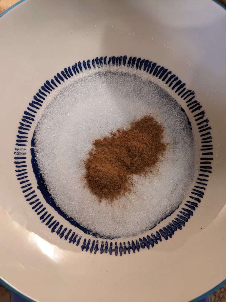 Prepare for the end before you’ve even started: on a plate or in a shallow bowl combine 55g sugar and 2tsp of sugar.