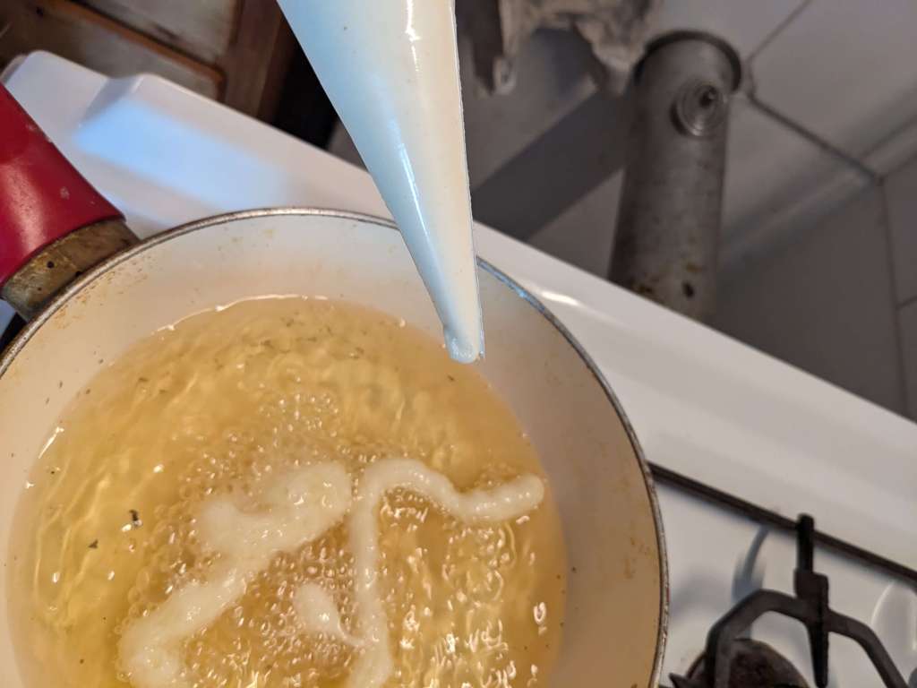 Pipe in 15cm of churros batter snipping at the end (snip the batter close to the oil so you don’t get a nasty hot surprise).