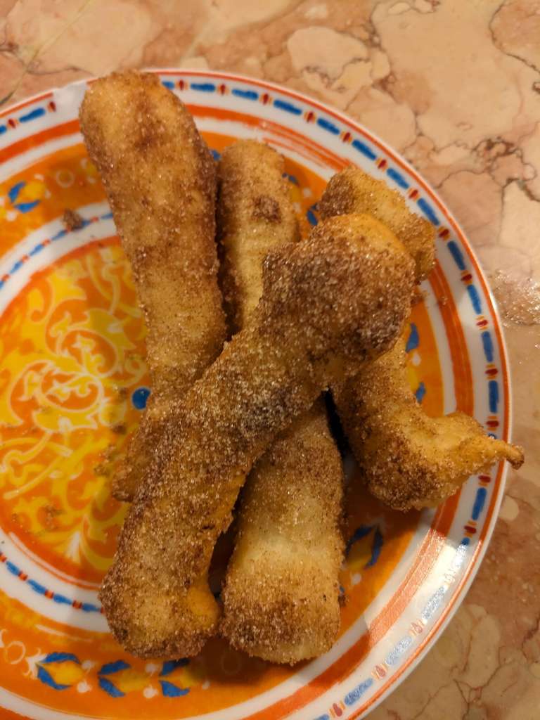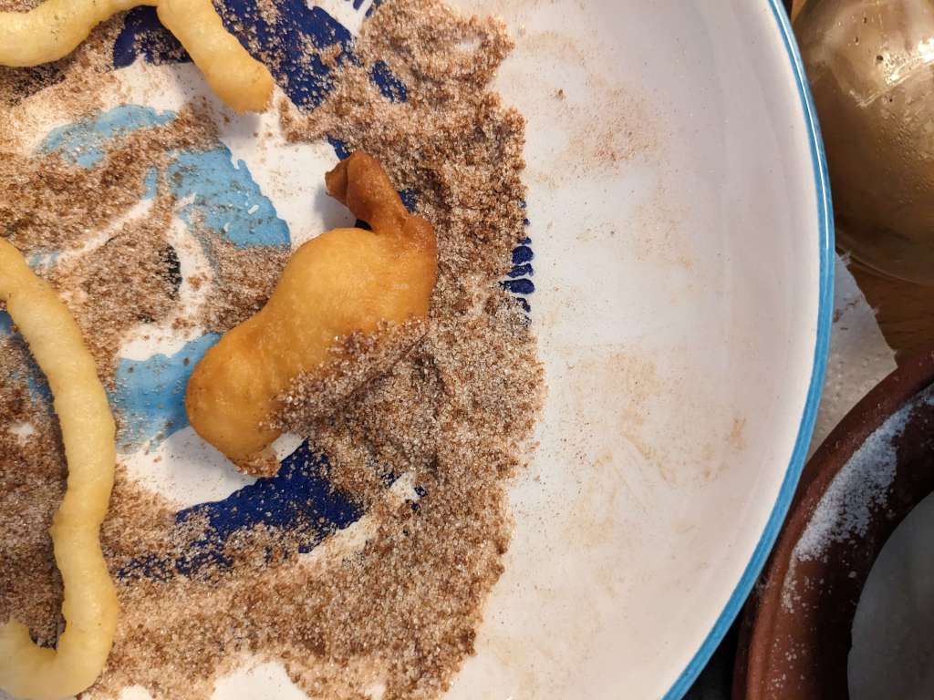 Cook for 2-3 minutes rolling the churros around like they are drunk in a hot tub and then remove the churros, placing them on a sheet of kitchen roll.