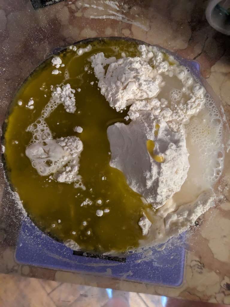 In a large bowl mix 375g plain flour, 85ml olive oil, 1/2tsp salt and 185ml water.