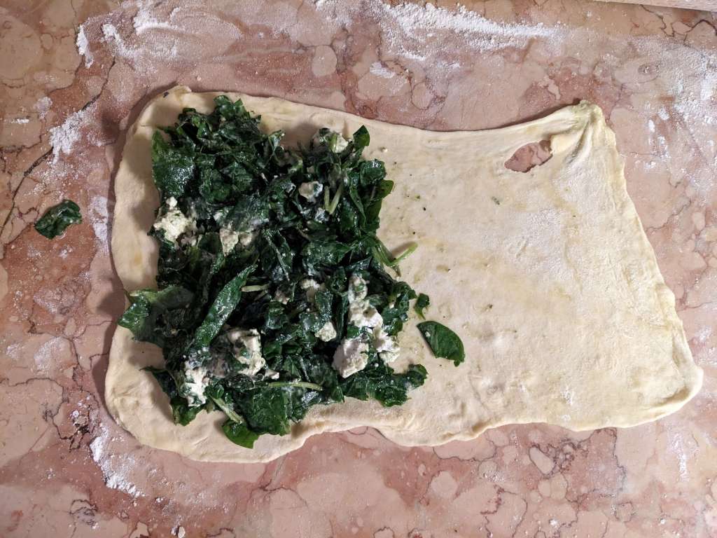 After 20 minutes take your dough out of its resting place. Cut it into 4 equal parts. Roll each dough ball into 35x20cm rectangles.
