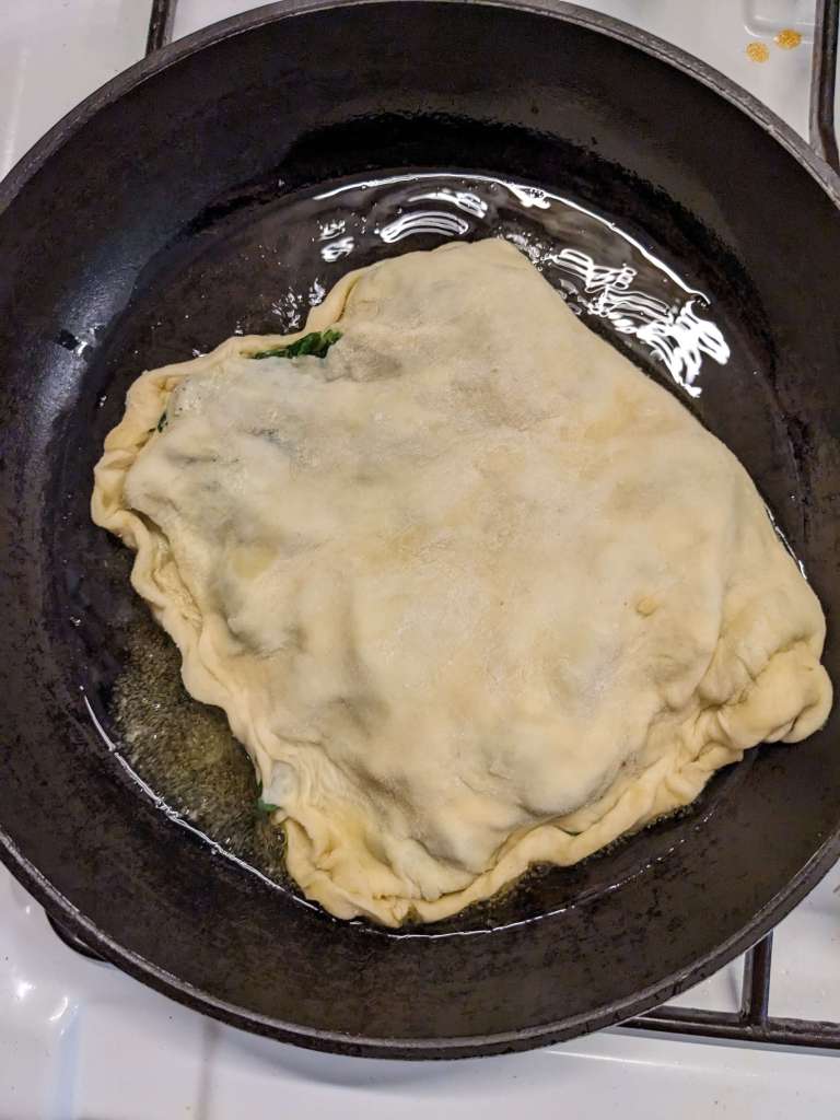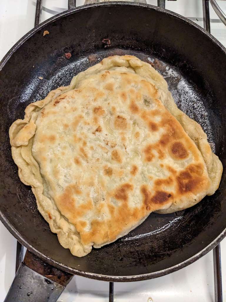 In a large frying pan, heat 1.5tbsp oil on a medium high heat. Once hot slip-slide one of your ready made gozleme into the pan. Cook for 3 minutes on white side, pressing down gently with a spatula.