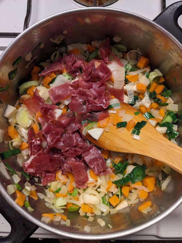 Channel your inner ‘The Bear’ restaurant skills and finely chop up your medley of vegetables (i.e. 1 onion,1 leek, 200g carrots (about 3) and 150g celeriac). Add these to a saucepan with 1tbsp of butter. Allow this to cook for for 5-10 minutes before adding in 50g Bündnerfleisch/Bressoala and sautéing for another 5 to 10 minutes until everything is soft and fragrant.