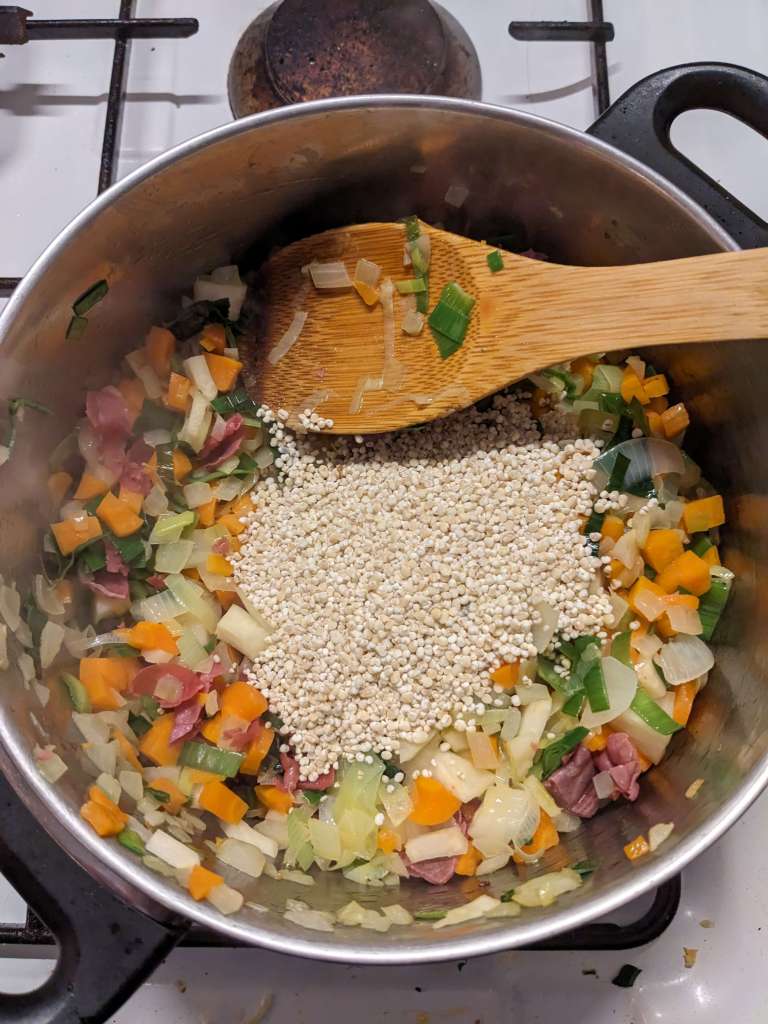 Add the pearl barley, and stir everything together so it gets coated in the vegetable and meat juices.