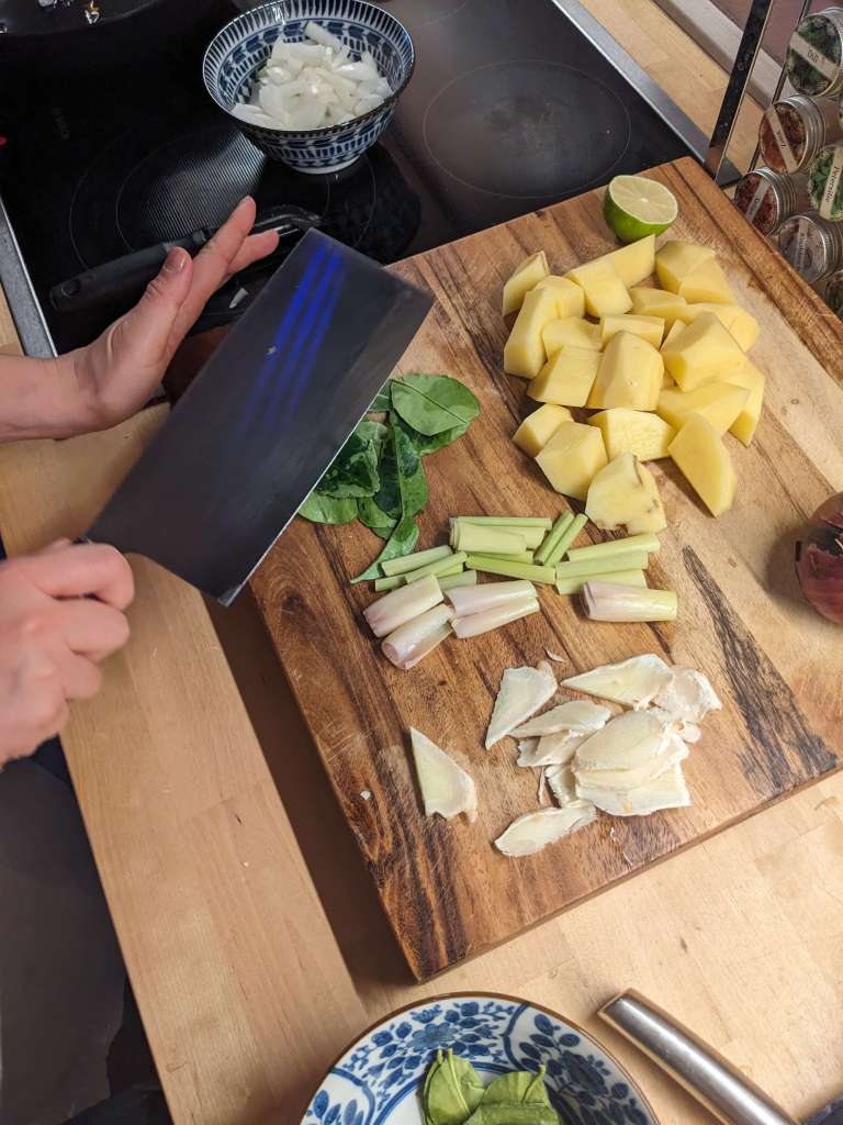 1) Slice the galangal, onion and garlic. Chop up the lemongrass and chillies into small pieces