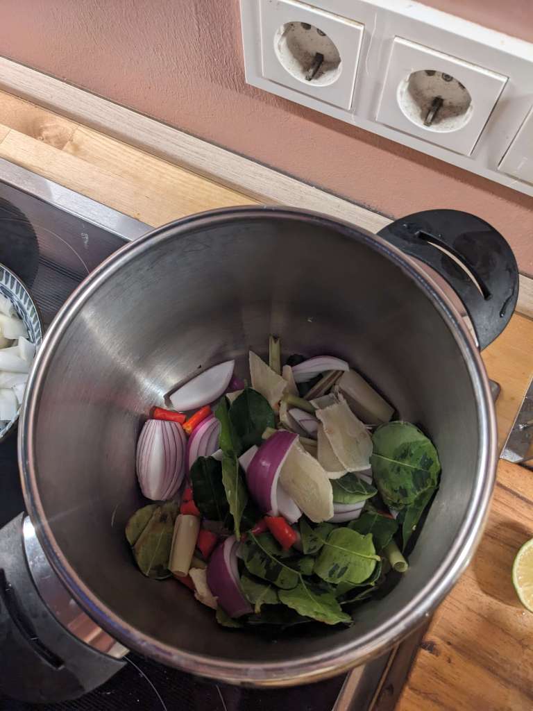 2)Stir fry all of these chopped ingredients along with the lime leaves, no oil needed. Just medium low for 2 min