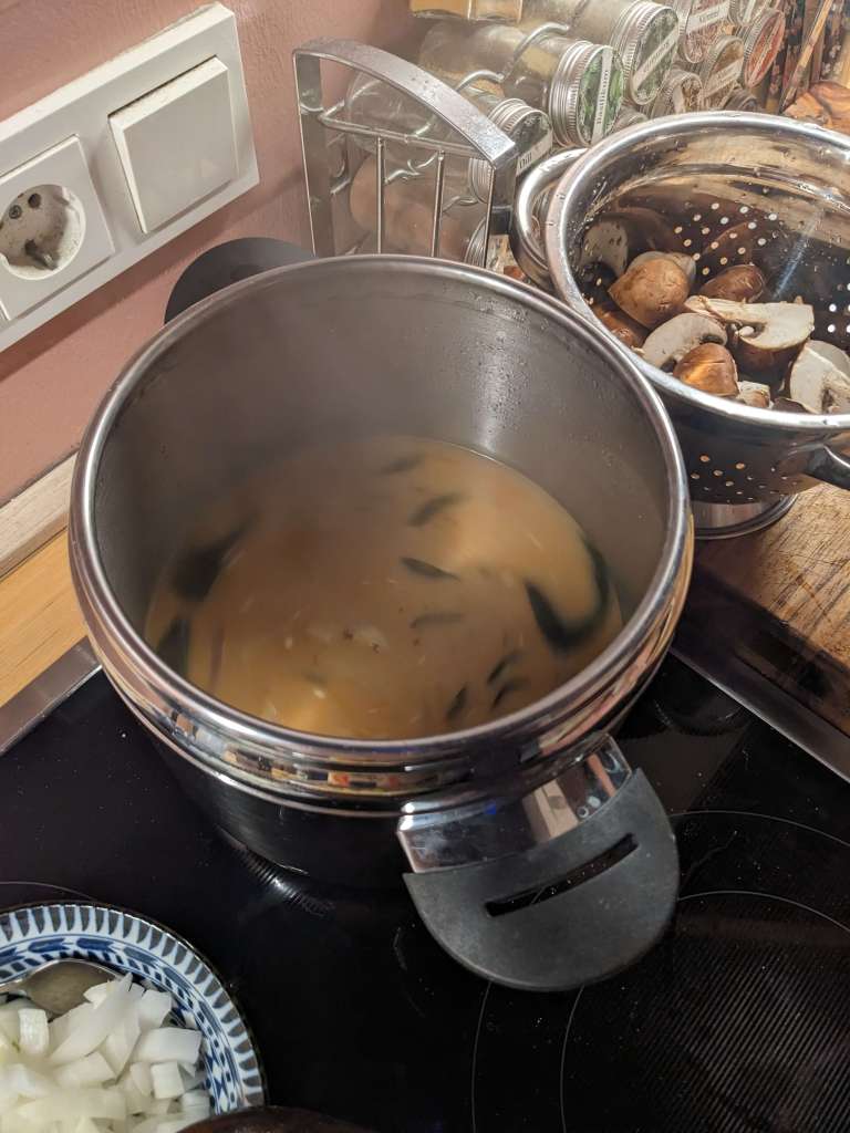 5) Add shrimp, boil until it’s just done add the mushrooms