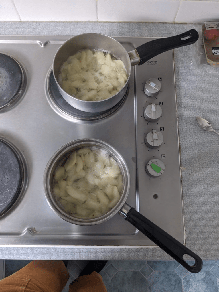 - Cover the apples in the saucepan with water and cook on a medium heat on the hob for 5-10 minutes