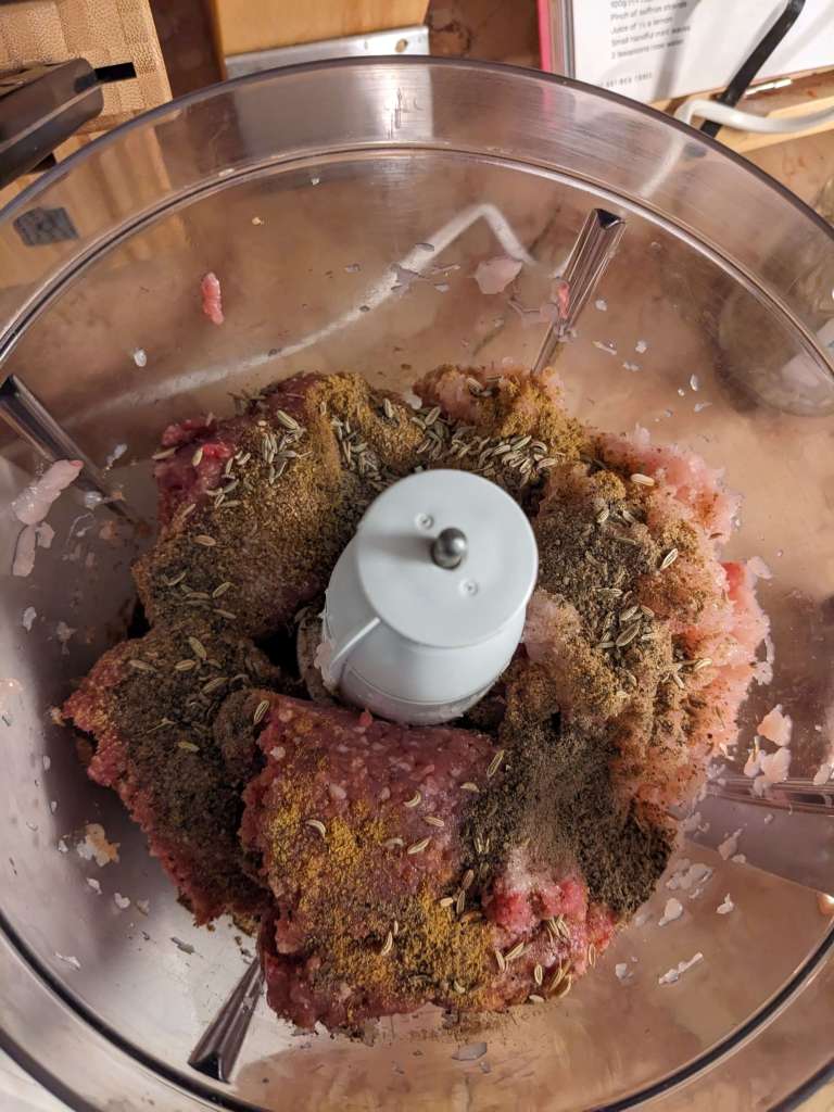 Seeing as minced chicken is hard to come by (at least in Germany) the best step would be to blitz your 225g of chicken in a blender before you combine it with the other ingredients. Once you have your minced chicken, add 225g of minced lamb, 1 1/2 tsp of salt, 1/2tsp cumin, 1/2tsp coriander, 1/2tsp of caraway seeds, 1/2tsp of black pepper. Either give this a quick blitz together again or mix together with your hands.