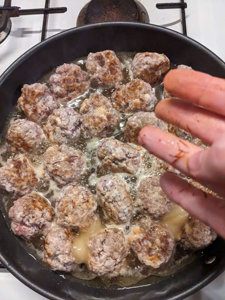 Heat 2tbsp of olive oil in a frying pan and add the meatballs, frying until brown on all sides – this should take around 5 minutes. Add in 75ml of water, 3tbsp of honey and your lovingly shelled 100g of pistachios. Crumble in your saffron, trying not to get too much stuck to your fingers on the way…